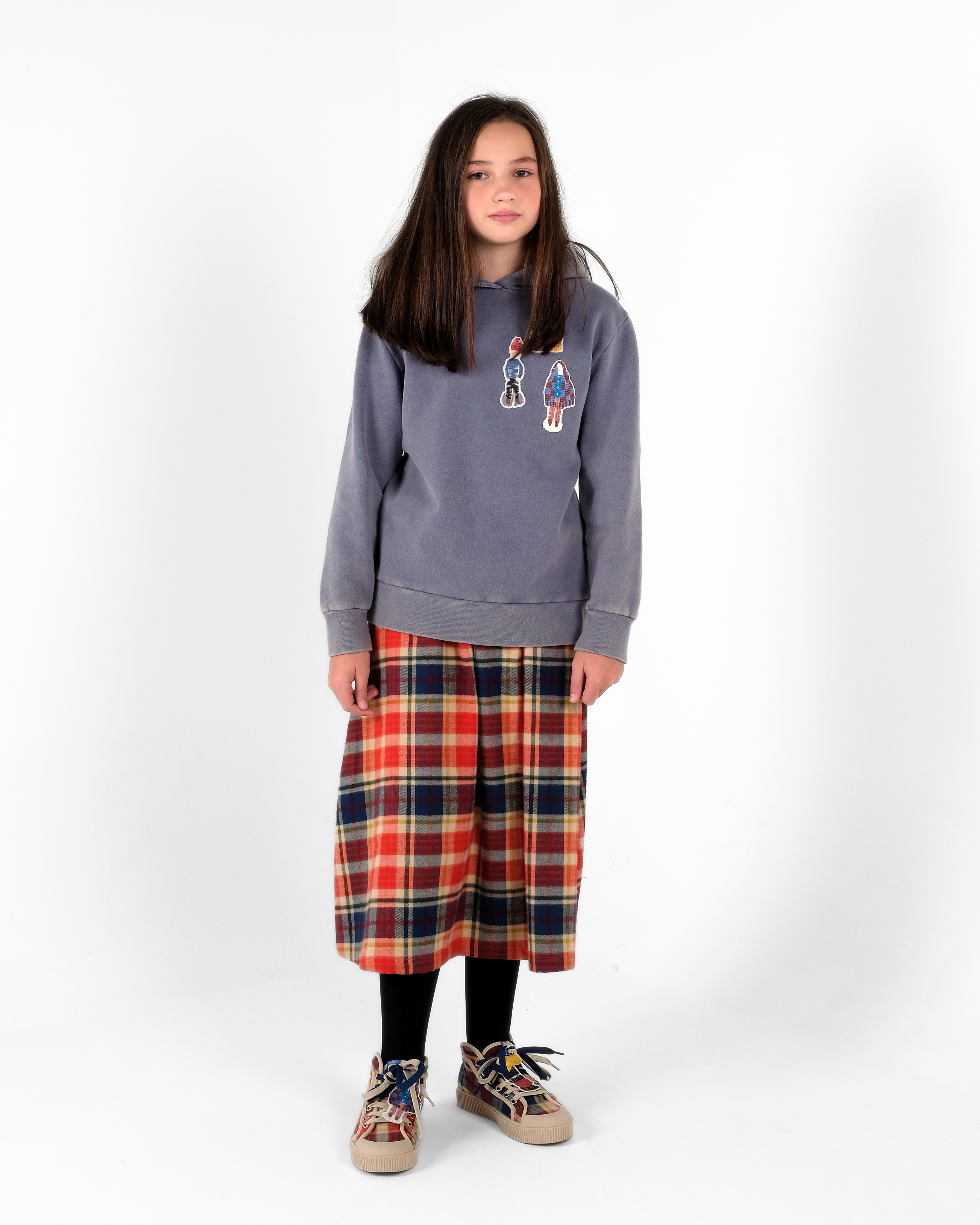 藍灰調的洗舊效果,內面為薄絨材質,胸口縫上三個不同的可愛徽章,更添活潑感!建議搭配同系列長褲;女生可搭本季的紅色格子中長裙,一樣酷!